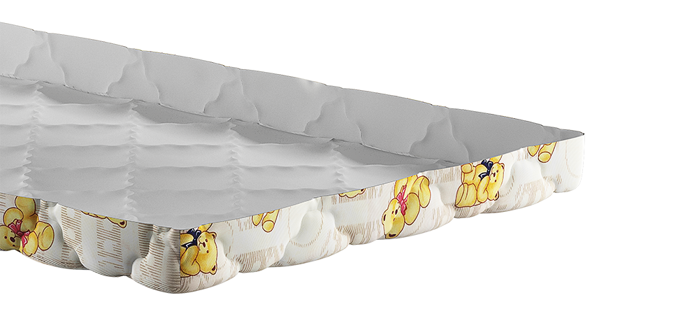 Верхнее покрытие матраса бязь с детским рисунком - хлопчатобумажная ткань полотняного переплетения. Особенность плетения заключается в том, что нити основы и утка имеют одинаковый размер и переплетаются равномерно. Ткань не имеет характерного блеска. Материал полностью натуральный. В целях достижения большей плотности, в волокна бязи добавляют синтетические нити. Однако доля синтетической примести не превышает 20%. Бязь широко используют при изготовлении верхнего покрытия детских матрасов.
